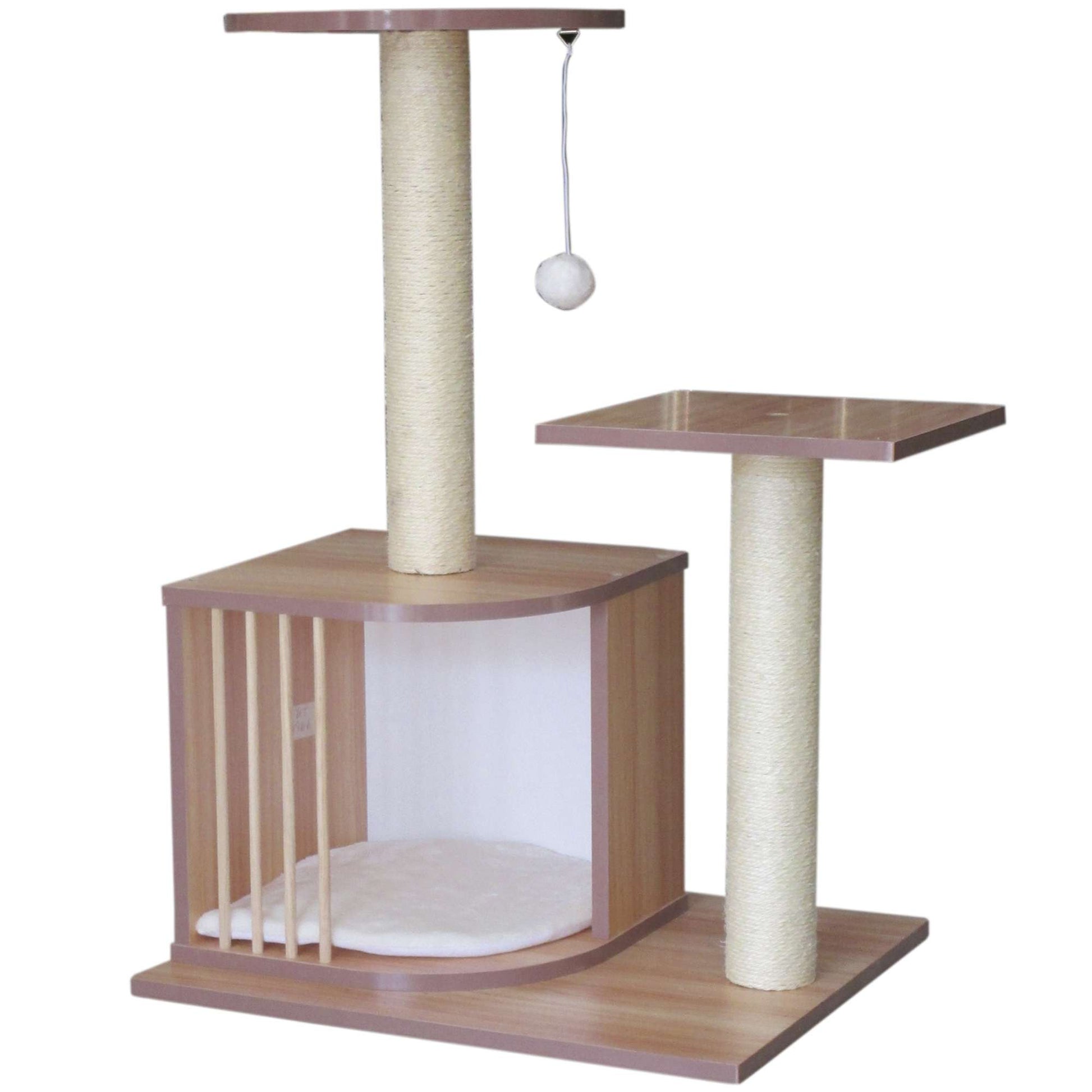 Este rascador de tamaño mediano es ideal para gatos juguetones, incluye varias zonas de descanso repartidas en tres alturas siendo una de ellas una gatera acolchada para que se convierta en la zona perfecta de descanso, incluyendo unos soportes de sisal, un material perfecto en el que los gatos afilen sus uñas.