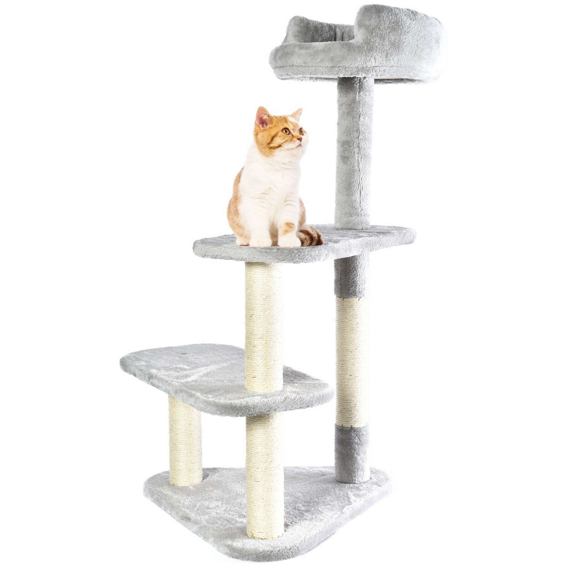 Los diversos postes de sisal ofrecen un lugar ideal para que tu gato pueda rascar y mantener sus garras en forma, evitando dañar los muebles para satisfacer estas necesidades. Este rascador tiene un diseño sencillo en color gris que se combina fácilmente con la decoración de tu hogar y ofrece a tu mascota un espacio exclusivo para descansar, observar y rascar